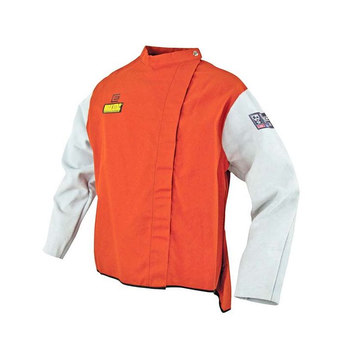 The WAKATAC® welding jacket with chrome leather sleeves is 762mm long and made from WAKATAC® Proban®. The jacket has an extended back for extra protection and has an off-set hook and loop closure for extra durability. The addition of chrome leather sleeves offers extra durability for the sleeve area which is usually destroyed first by welding spatter and dross.