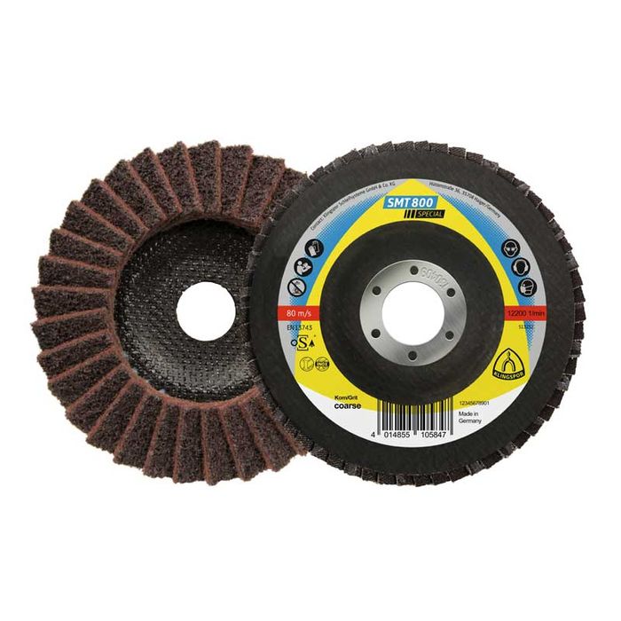 The flap disc perfectly blends metal removal efficiency with an even surface pattern. This top-quality tool sets itself apart with an excellent service life - qualities that make it uniquely economical. Consistent results and maximum safety are guaranteed by the quality of the workmanship that has gone into this Special abrasive mop disc.