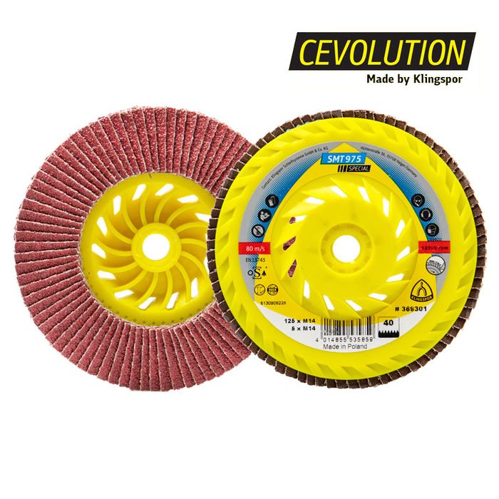The Klingspor SMT 975 SPECIAL Trimmable is a flap disc that manages to impress with numerous properties: Its innovative ceramic abrasive grain combined with CEVOLUTION technology and the trimmable plate provides for previously unheard-of longevity. CEVOLUTION lets the SMT 975 deliver a long service life and extreme aggressiveness. Made of plastic, the plate is easy to trim, allowing the user to utilise the still unused abrasive material found on the inner side of the plate. This gives the product extra service life over a conventional flap disc.