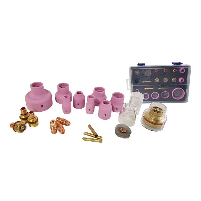 • 20 piece nozzle kit featuring a range of standard collet bodies and gas lens