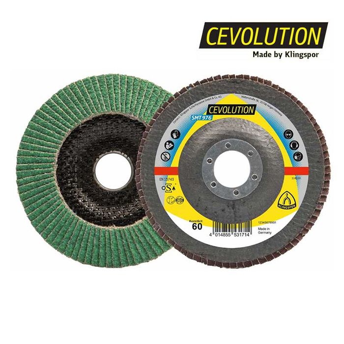 The engineers at Klingspor optimised this flap disc for use on stainless steel. Its multibond coating and self-sharpening effect turn the SMT 976 with CEVOLUTION technology into an admirable performer which - compared to its predecessor the SMT 996 - impresses with more aggressive grinding and a longer service life. The multibond helps reduce the grinding temperature in the grinding zone. This makes the SMT 976 ideal for stainless steel.
