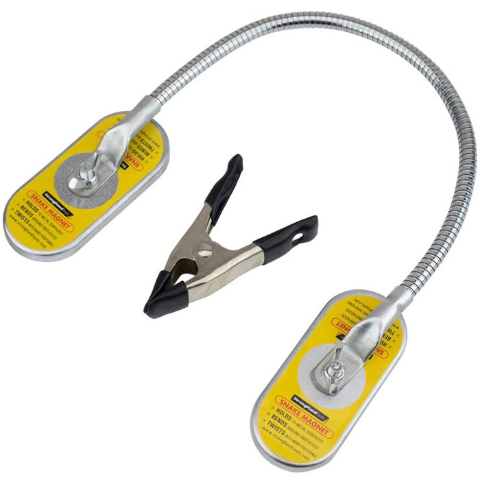 The StrongHand Flexible Snake Magnet gives you the flexibility to hold stock at odd angles. Spring Clamp can be used as a third hand to hold tools. Magnetic V-Pad adjusts for different shapes: round, flat, and angle metal surfaces.