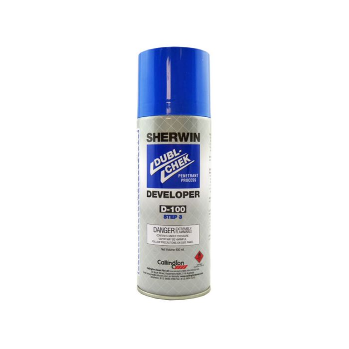 Dubl-Chek D-100 Developer consists of refined white particles suspended in isopropyl alcohol that produces enhanced sensitivity for locating tight flaws. D-100 developer pulls flaw-entrapped penetrant to the part surface and creates a contrasting vivid white background. Complies with low sulphur and low halogen requirements.