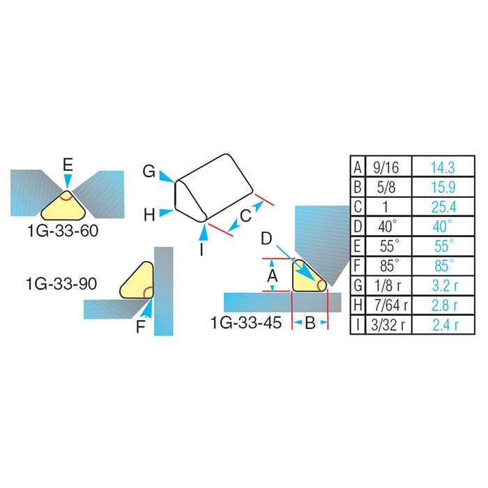 All 1G33 tiles are suitable for K or X preps where the bevel angles are 45, 60 or 90 degrees. Also suitable for welding with MIG/MAG solid wire, metal cored or flux cored wires. They are a substitute for round tiles where the benefit of the 1G33 range of tiles is a "full-face" contact with the joint preparation... reducing the risk of burn-through as may occur with the round tiles where you have a single point contact of the tile with the work piece. 1G33-90 also used when reverse side of a single bevel, single V butt joint where the reverse angle will always be 90°.