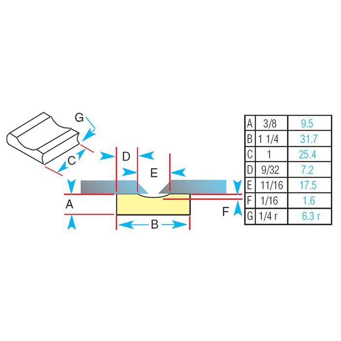 This tile is a larger tile and has a larger groove than the 1G42 tile or the 1G41-R tile where the user needs more penetration and more substance in the tile. Possibly for submerged arc welding applications and thicker plates. Each tile is radiused to form a strip around the cylinder.