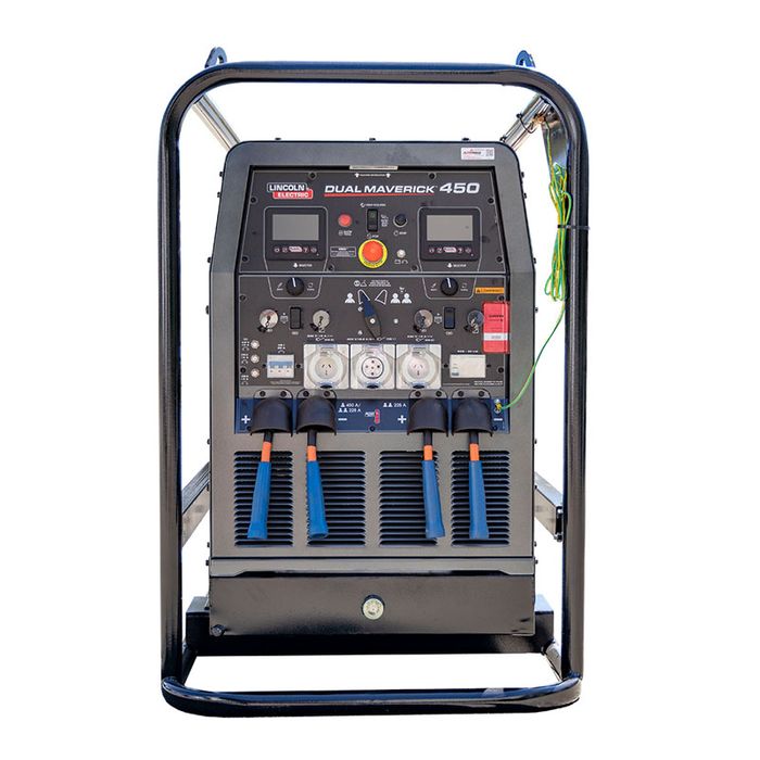 The Lincoln Electric Dual Maverick 450 is a high speed, diesel engine-driven welder/generator capable of dual or single operator DC multi-purpose welding. The machine features 220 VAC single phase and 380 VAC three phase auxiliary power, a user interface screen for advanced features and patented Chopper Technology.