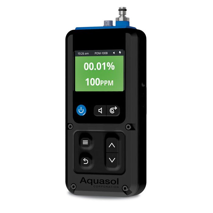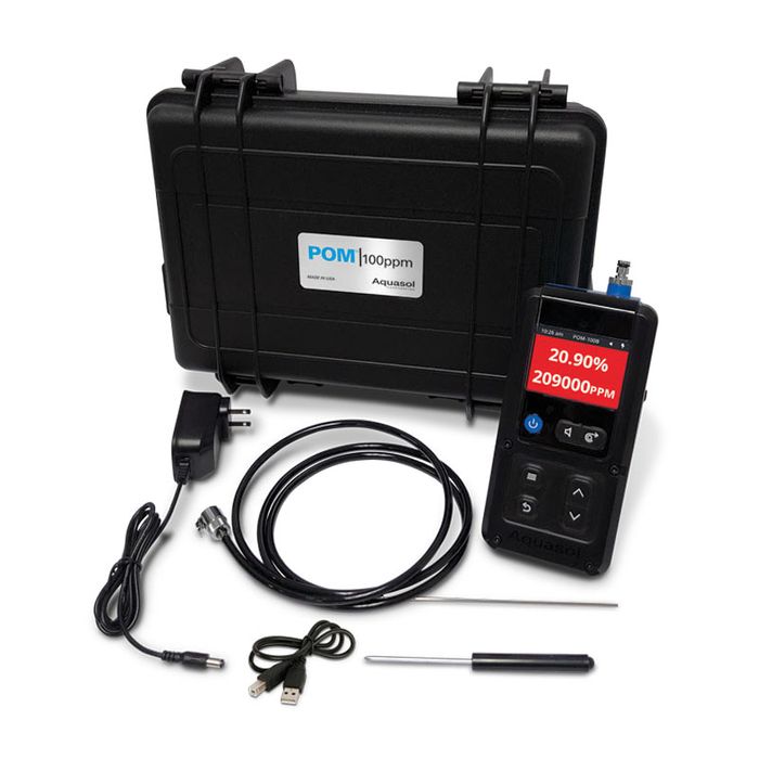 The Aquasol POM-100B is a battery-powered, Bluetooth transmitting, rechargeable, handheld digital oxygen monitor with an internal pump that accurately measures oxygen concentration with 0.01% (100 PPM) resolution. Oxygen is displaced by the purge gas to a pre-determined level set by the operator. Evacuation of oxygen is paramount in high purity welding to prevent oxidation, discoloration and coking.