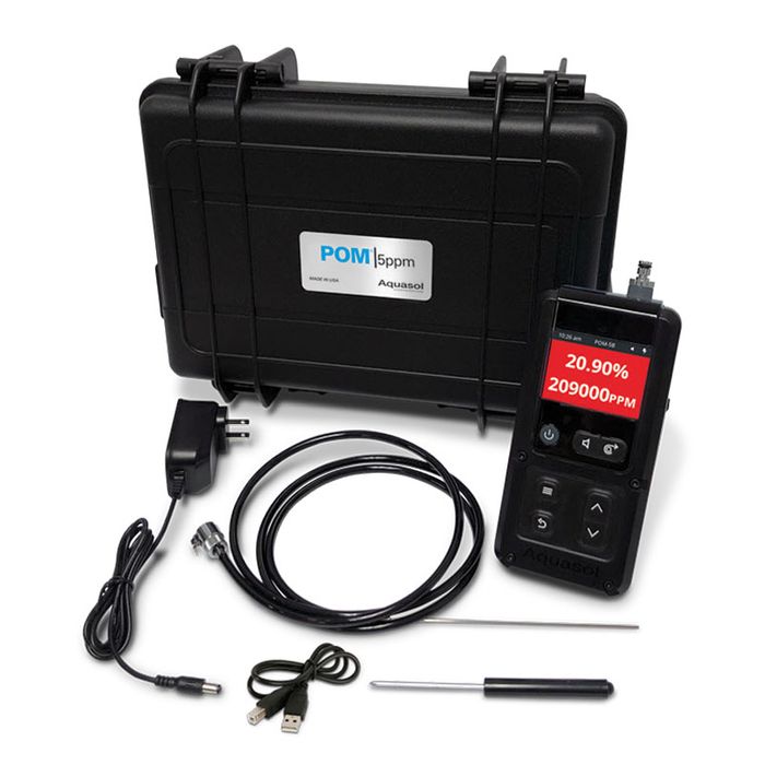 The Aquasol POM-5B is a battery-powered, Bluetooth transmitting, rechargeable, handheld digital oxygen monitor with an internal pump that accurately measures oxygen concentration with 0.005% (5 PPM) resolution. Oxygen is displaced by the purge gas to a pre-determined level set by the operator. Evacuation of oxygen is paramount in high purity welding to prevent oxidation, discoloration and coking.