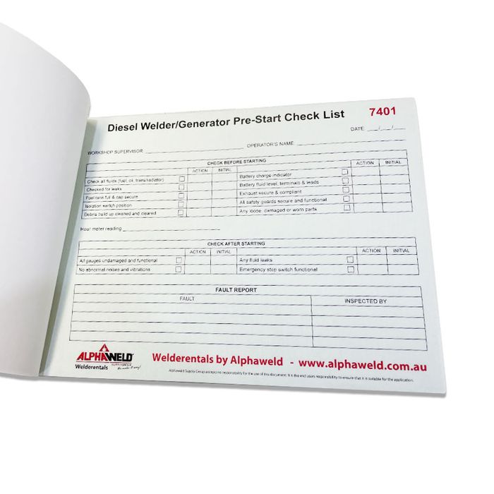 Keep your portable plant maintained by starting each shift with a Diesel Welder Prestart Log Book. This will assist in recording key information before starting generators and also after starting. It allows for faults and inspections to be recorded.