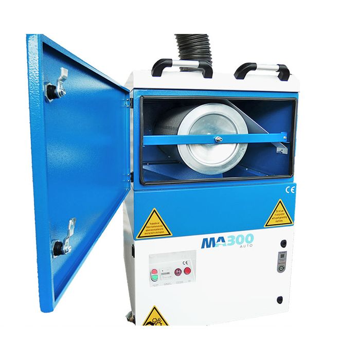 The AllClear MA300-auto is a durable mobile welding fume extraction unit equipped with a 3-metre arm. The AllClear MA300-auto has an auto air rotating filter cleaning system. The AllClear MA300-auto has cleanable cartridge filters, working hour counter, filter fullness indicator, malfunction warning and a special dust collection bin.