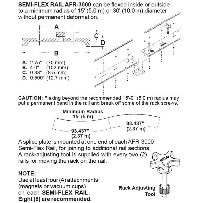 Semi Flex Rail (AFR-3000) can be flexed inside or outside to a minimum radius of 15' (5.0m) or 30' (10.0m) diameter without permanent deformation.