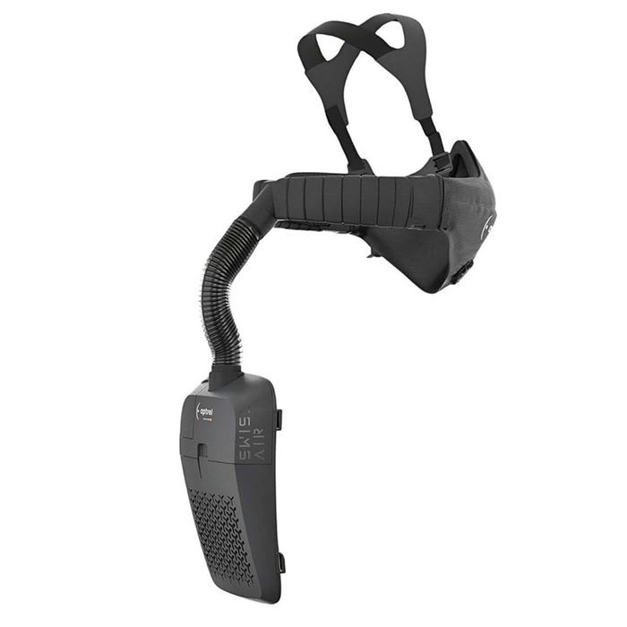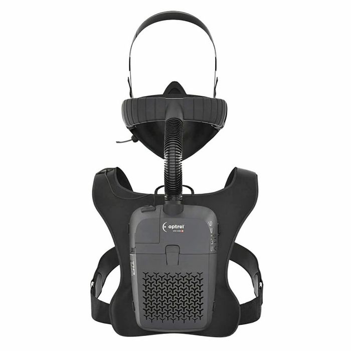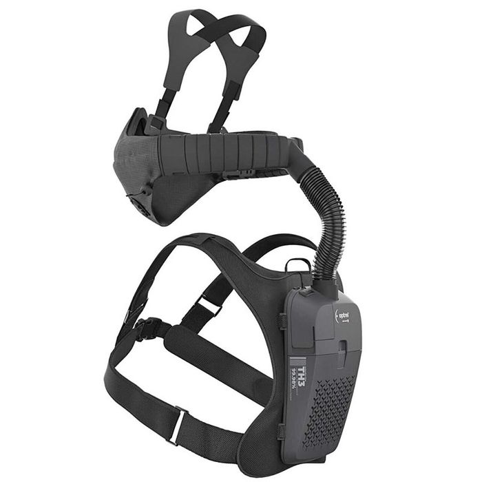 The Optrel Swiss Air is a ventilated half-mask made of flame-retardant material that covers the mouth and nose area. This TH3-certified blower breathing protection system provides respiratory protection of the highest class and ensures no passage for aerosols, smoke, particles, or viruses.