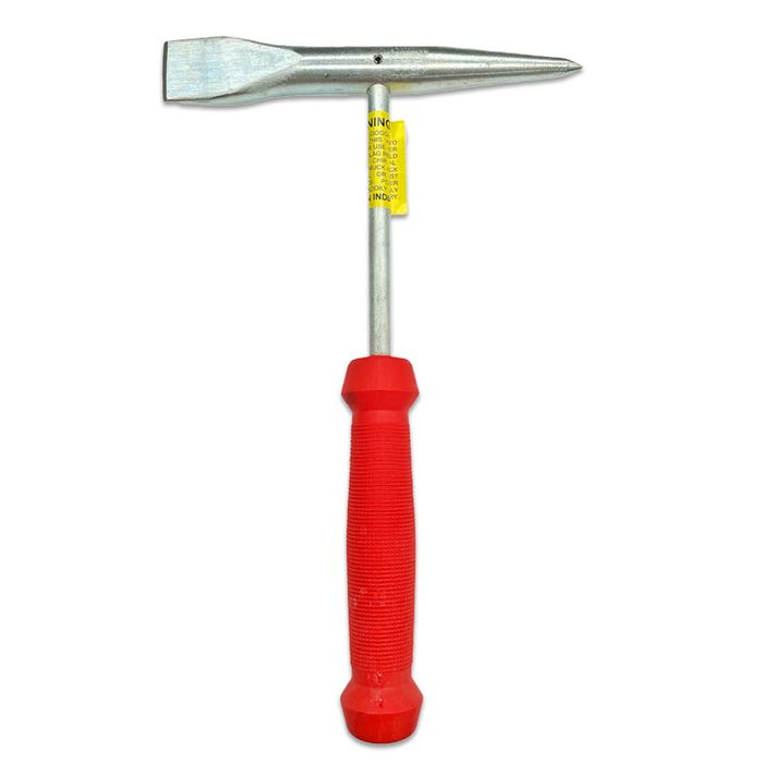 Chipping Hammer that helps you easily remove slag from welds. Contains a pick head with a sharp point on one end, and a beveled chisel on the other all wrapped up with a firm rubber grip.